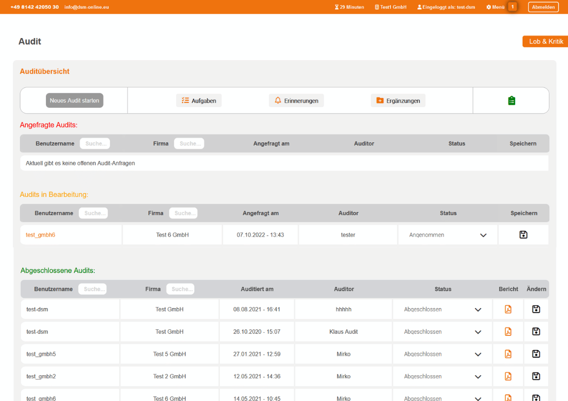 Mit unserem Modul für Audits erstellen Sie Tätigkeits- und Prüfberichte schnell, übersichtlich und strukturiert. DSM-Online unterstützt Sie dabei, alle relevanten Informationen aus der Mandantendokumentation effizient zusammenzuführen. Die Ergebnisse werden klar dargestellt, sodass Ihre Datenschutzarbeit für Ihre Kunden nachvollziehbar und präsentationsfertig ist.